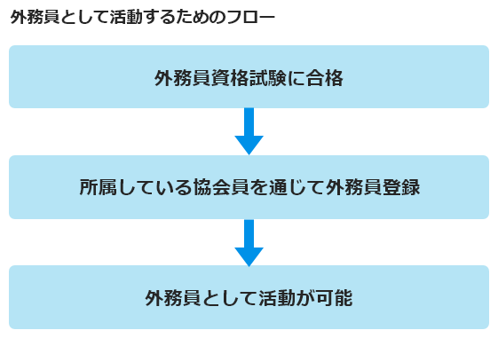 - 外務員として職務を行う場合は、外務員資格試験に合格した後に、所属している協会員を通じて本協会へ外務員登録申請を行い、外務員登録を受ける必要があります。