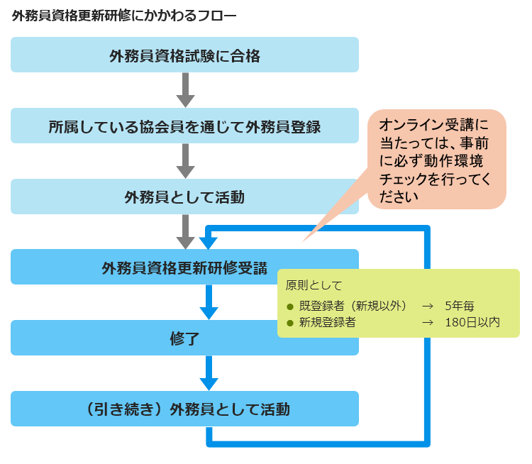 - 外務員登録を受けている方は、原則として、外務員の登録を受けた日から5年毎に受講しなければなりません。また、新たに外務員の登録を受けた方及び再び外務員の登録を受けた方は、原則として、180日以内に受講しなければなりません。
